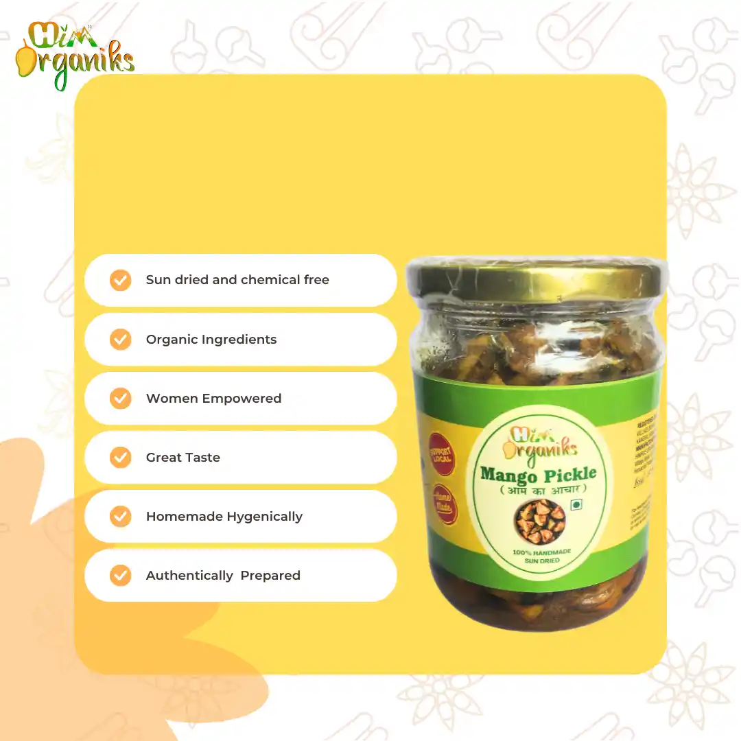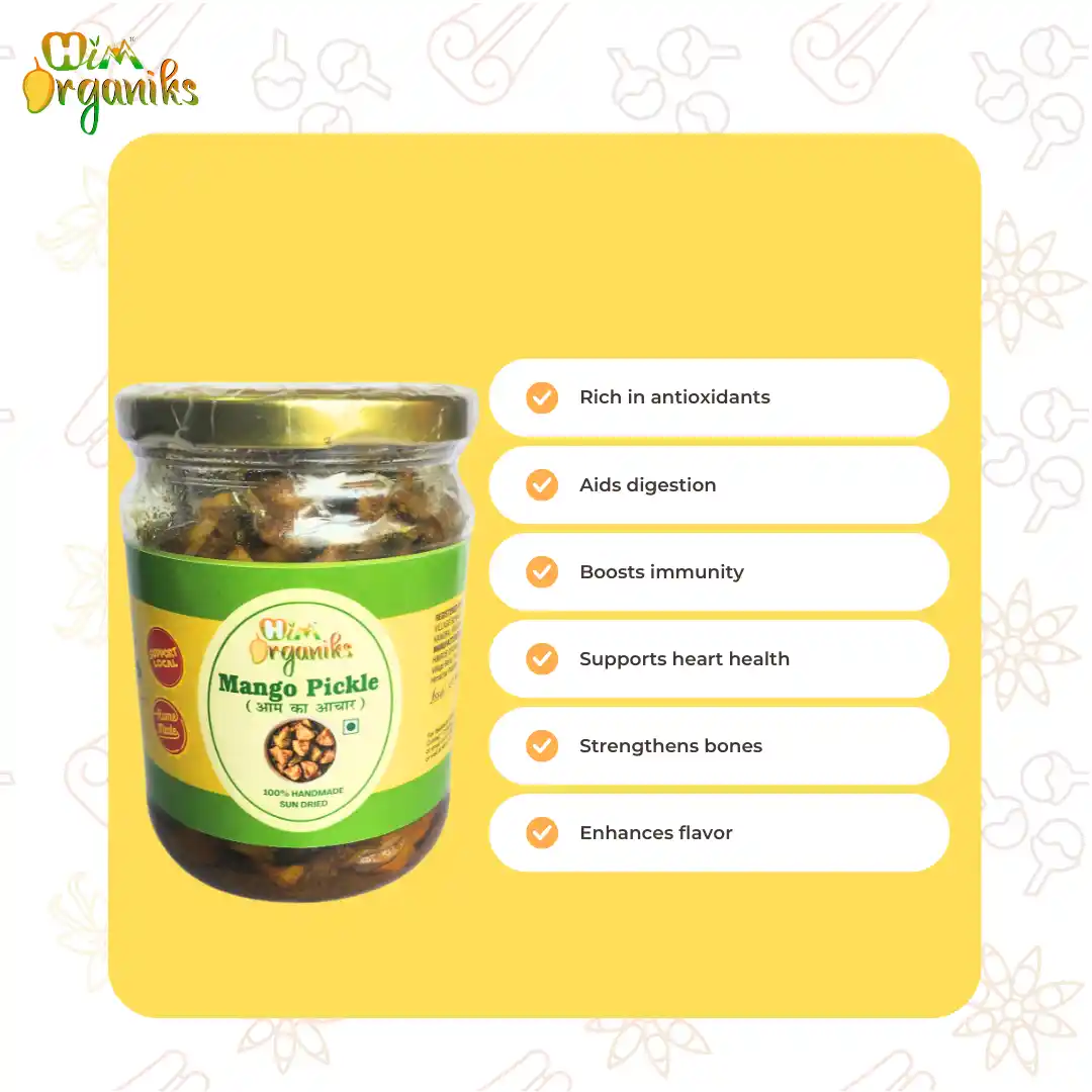 - 100% Organic Ingredients: Our pickles are made from mangoes and spices that are organically grown in the pristine Himalayan soil, free from synthetic fertilizers and pesticides. Each ingredient is carefully selected to ensure the highest quality and flavor.
